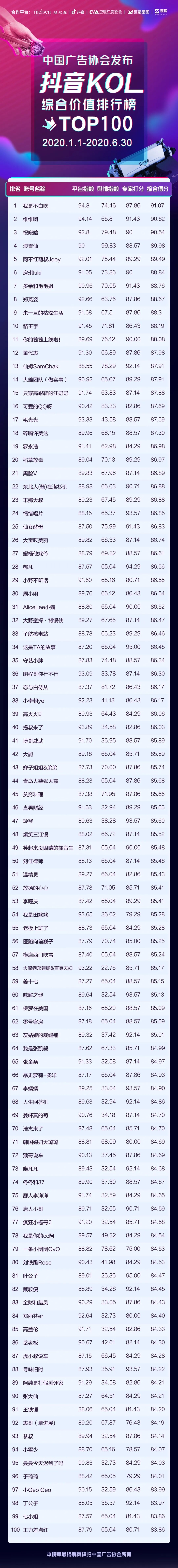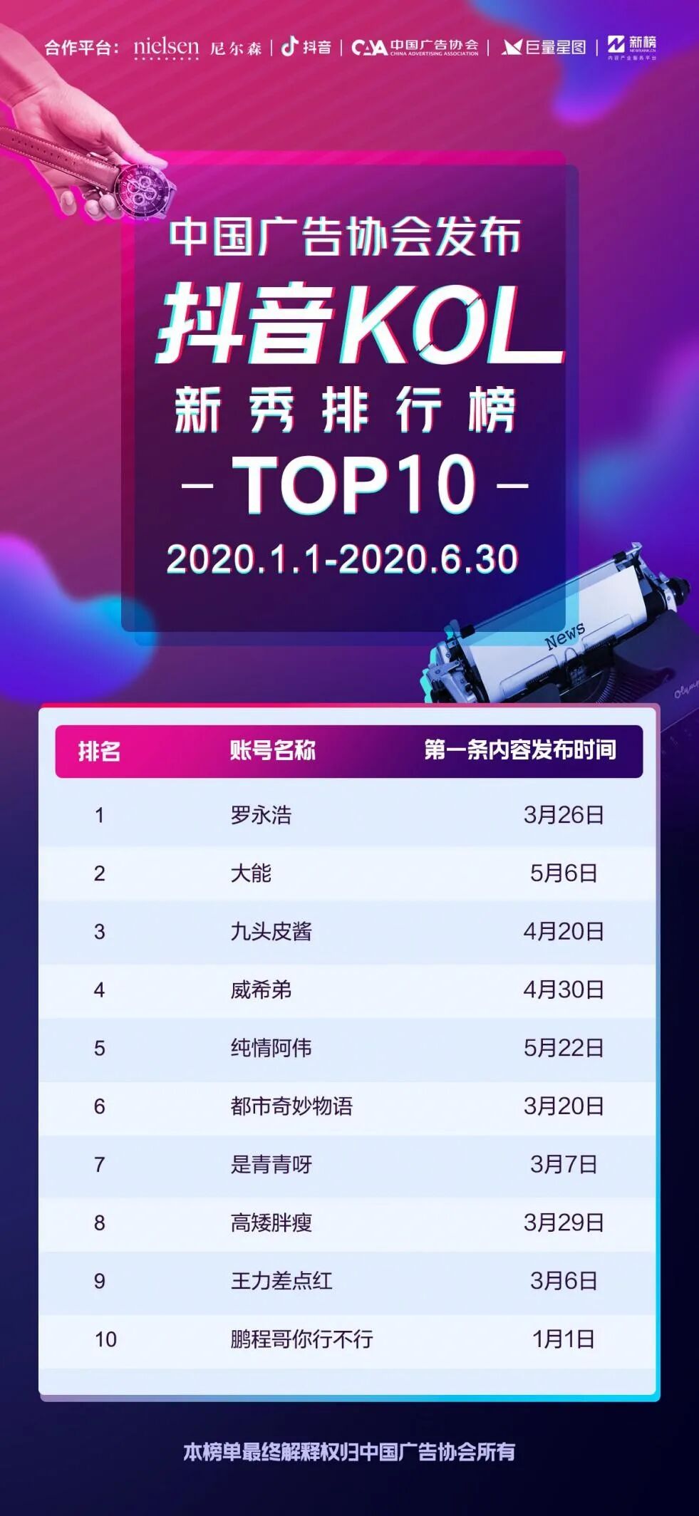 2020年7月31日,中国广告协会社会化营销分会(合作平台:抖音、巨量星图、尼尔森、新榜)在长春举办的中国广告论坛上发布了发布《抖音KOL综合价值半年榜》,从传播力、全网口碑和专家打分三个维度综合评估抖音达人。本榜单兼具社会影响力和商业影响力,帮助广告主全面了解KOL画像,实现营销活动的最大价值。同时,本榜单也为行业树立标杆,引导KOL端正言行、承担社会责任,和各方一起共建健康有序的行业生态。尼尔森中国区副总裁龚毅对榜单进行详细解读,并对短视频行业趋势进行了分析。为树立行业导向、引导短视频领域发展秩序,鼓励优秀内容原创作者,为广告主提供更为全面的参考分析数据,此榜单以平台指数、舆情分析、内容打分为三个主要纬度。本次榜单的推出具有三个重要意义。首先是平台数据真实去水,巨量星图度量衡体系为本榜单提供了KOL从播放数据、粉丝粘性、商业价值到作弊风险等多个维度的数据表现,这是市面上关于抖音KOL榜单数据覆盖范围最全面完整的一次评选。其次,本次评选不止于抖音平台数据表现,更引入了关于KOL的全网舆情分析,根据全网影响力和正负面评价,完整描摹KOL的社会形象,这是业内第一次从社会影响力的角度评价KOL;再次,本次评选邀请了广告主参与专家打分,真实反映了市场对KOL在类型和创意主题方面的需求方向。综合以上三个方面,中国广告协会推出本次榜单,为行业建立了一个公正权威可参考的综合性榜单,也为短视频的评估建立了行业标准。对广告主来说,是一份专业、权威的社会化营销指南,协助品牌主多方面评估KOL,高效寻找与品牌调性相符合的创作者,避免只看数据忽略舆情而造成的品牌损失;对于KOL和MCN公司来说,是一份从业指南,提醒从业人员规范言行,不为流量博眼球,勇于承担社会责任,创造更大社会价值。中国广告协会将于各平台方和专业数据公司合作,定期发布红黑榜单,帮助行业各方解决问题,推动行业高效可持续发展。- 其中剧情、记录生活日常、搞笑、美食及表演是前5,搞笑和美食等令人开心的主题仍备受欢迎